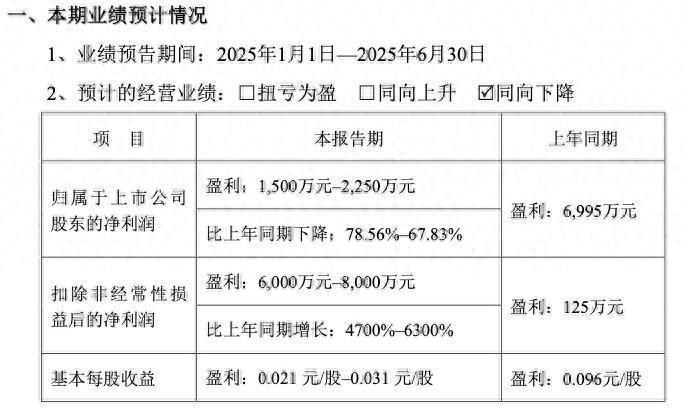 近期连续斩获5个涨停板的金安国纪(002636.SZ)7月9日晚间披露了2025年半年度业绩预告,公司预计归属于上市公司股东的净利润1500万元~2250万元,同比下降67.83%~78.56%;扣除非经常性损益后的净利润6000万元~8000万元,同比增长4700%~6300%,呈现出“冰火两重天”的业绩表现。