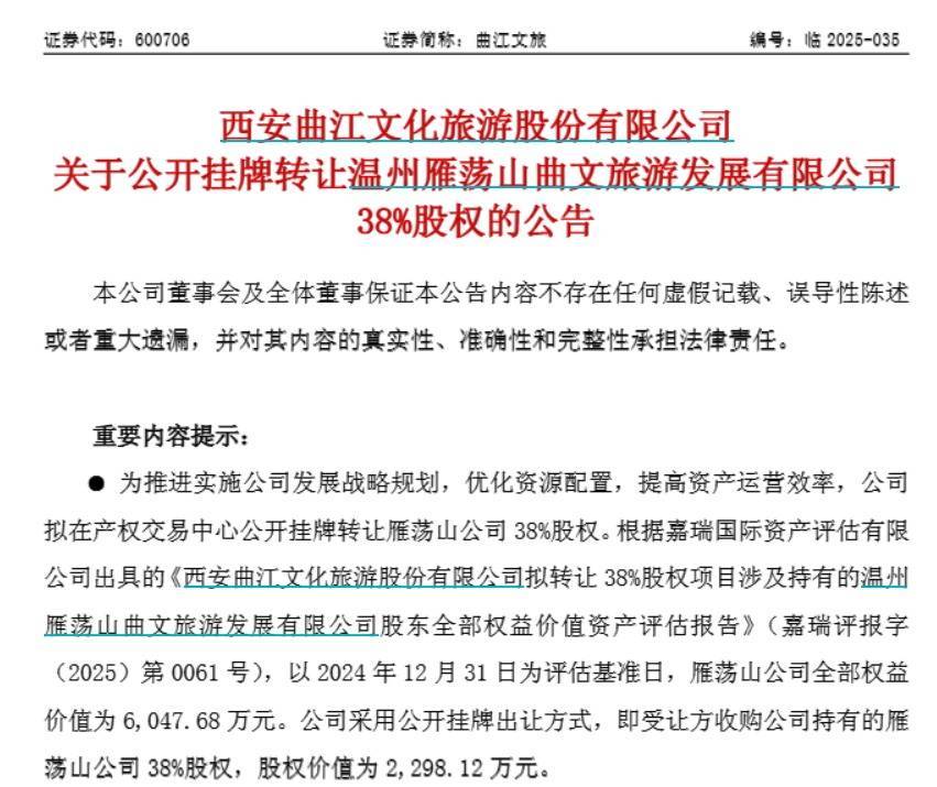 截至2024年末,雁荡山公司资产总额7479.33万元、负债总额1540.41万元、净资产5938.92万元,2024年度雁荡山公司营业收入505.2万元、净利润-1209.73万元。根据嘉瑞国际资产评估有限公司以2024年12月31日为评估基准日的评估结果,雁荡山公司全部权益价值为6047.68万元。曲江文旅采用公开挂牌出让方式,即受让方收购公司持有的雁荡山公司38%股权,股权价值为2298.12万元。
